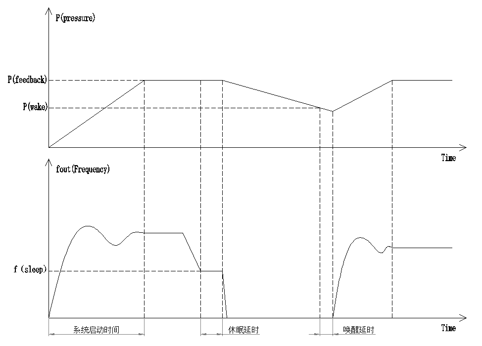 在恒壓供水控制系統中,為了節省電能和防止水泵頻繁啟停,要求當泵的速度低至輸出頻率下限,延時一段時間后變頻器自動停止輸出,進入休眠狀態;然后當壓力反饋值低于設定壓力下限值時,再自動喚醒變頻器。
