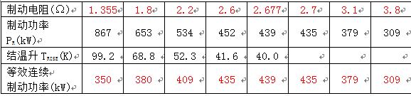 按上述計算辦法,選取多個制動電阻值,得到表四,等效連續(xù)制動功率-制動電阻數(shù)據(jù)表: