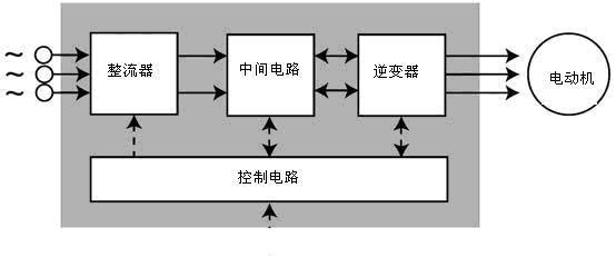 變頻器是把工頻電源(50Hz或60Hz)變換成各種頻率的交流電源,以實現電機的變速運行的設備。如圖1所示,其中控制電路完成對主電路的控制,整流電路將交流電變換成直流電,直流中間電路對整流電路的輸出進行平滑濾波,逆變電路將直流電再逆變成交流電。對于如矢量控制變頻器這種需要大量運算的變頻器來說,有時還需要一個進行轉矩計算的CPU以及一些相應的電路。