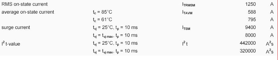 關鍵數據1:通態電流有效值1250A,與軟起動器的額定輸出電流能力1290A近似相同;