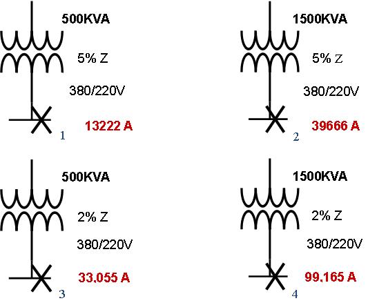 Z為電網(變壓器加上電纜)內阻。圖二以電網內阻為5%和2%為例,分別計算出Isca的值。