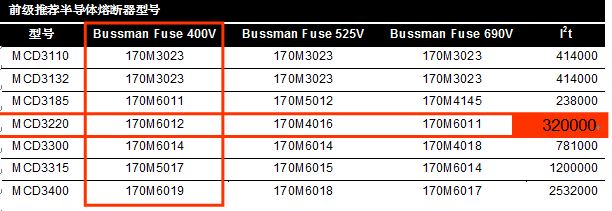 丹佛斯說明書中要求MCD3220前級安裝BUSSMANN的170M6012半導體熔斷器,要求的可控硅需要的短路保護I
