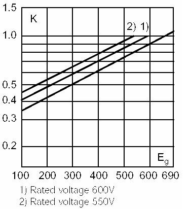 2t值為660V電網電壓時的數據,所以還要查表求出400V電網電壓時的修正系數,從下圖可以查到修正系數約為0.61。