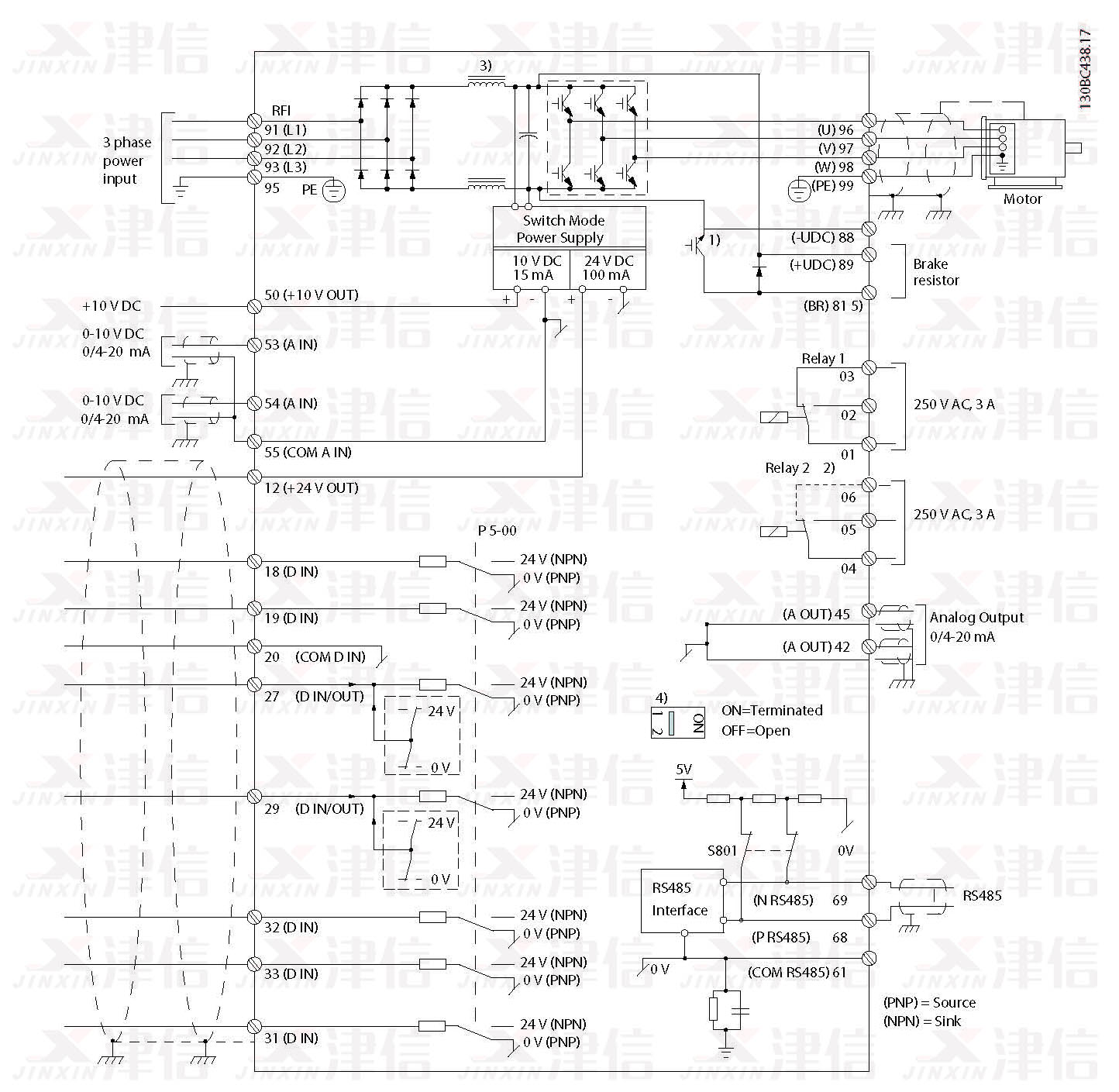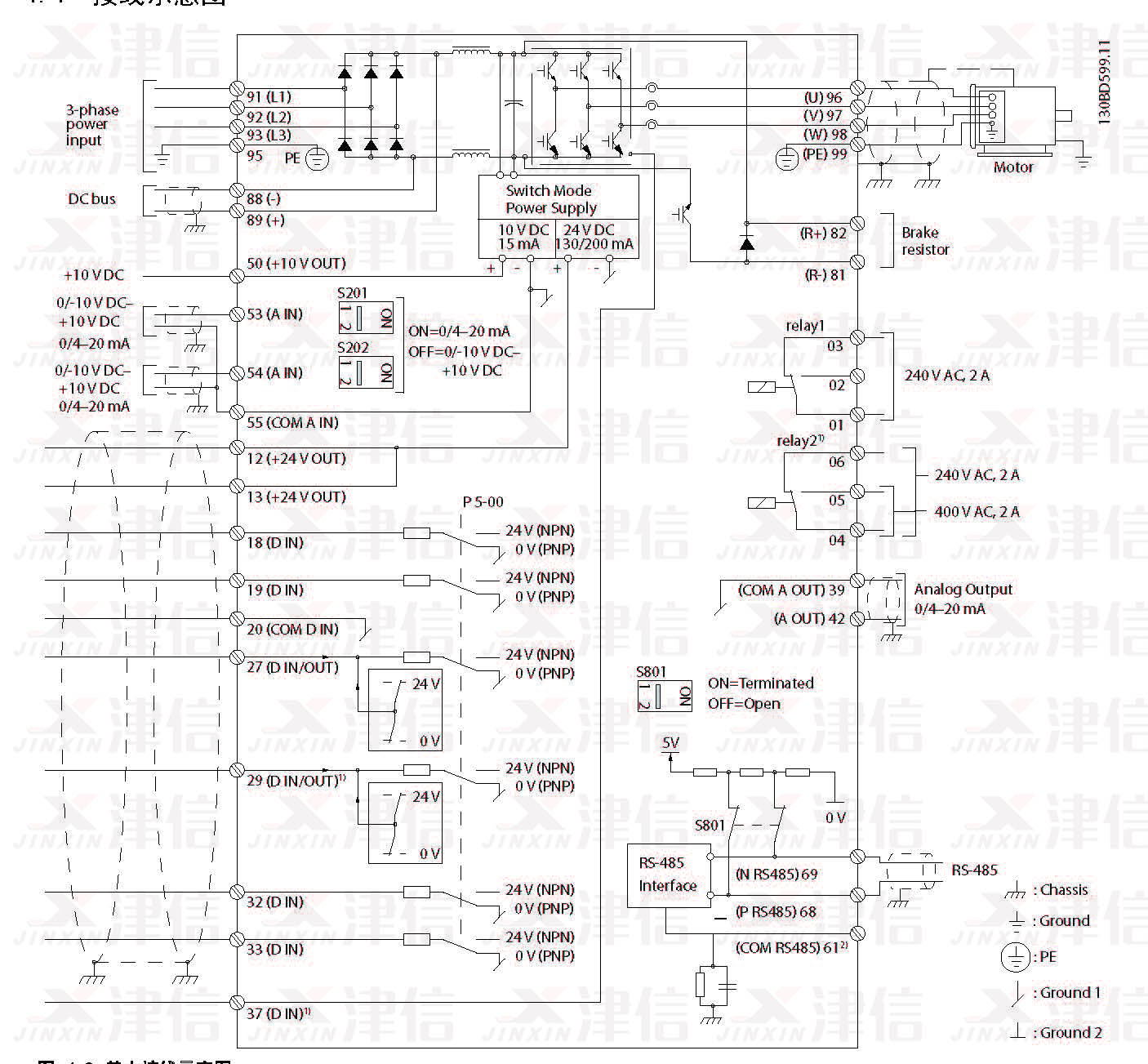 1) J1–J5 上配有內(nèi)置制動斬波器。