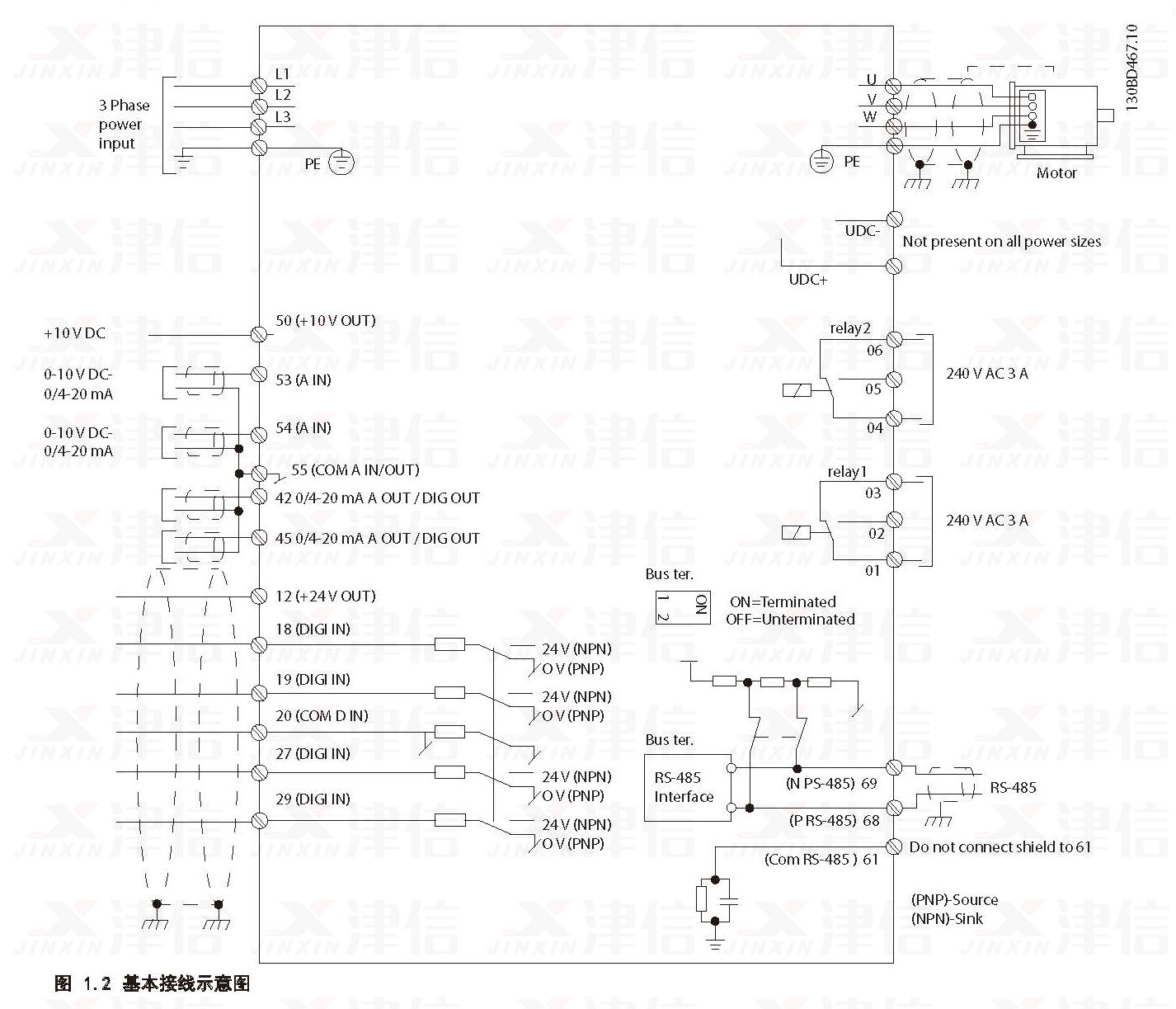 丹佛斯變頻器采用交-直-交工作原理,先將三相交流電經(jīng)整流部分變換成直流,經(jīng)濾波后通過IGBT或其它電力電子器件逆變成頻率和電壓均可變的三相交流電供電機使用。變頻器的基本構(gòu)成由主電路(包括整流器、中間直流環(huán)節(jié)、逆變器)和控制電路組成,以下是丹佛斯各系列變頻器的接線示意圖。