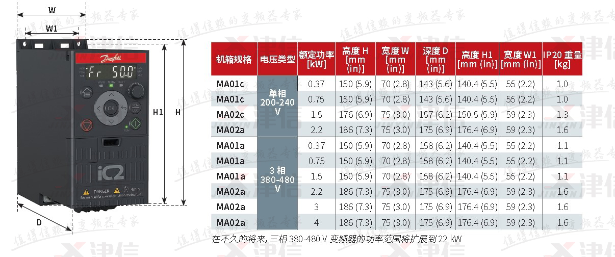 丹佛斯變頻器IC2提供單相220V和三相380V兩種輸入電壓規格,功率范圍從0.37-4KW,不久的未來,會擴展到22KW。