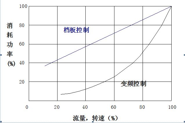 交流驅動系統實際使用時,可通過實測或根據其靜態特性的理論計算,作出其轉速對功率的特性曲線,由于轉速與流量成正比,該曲線即流量對功率的特性,如圖1所示。與檔板調節相比較,可見其節能是顯著的。