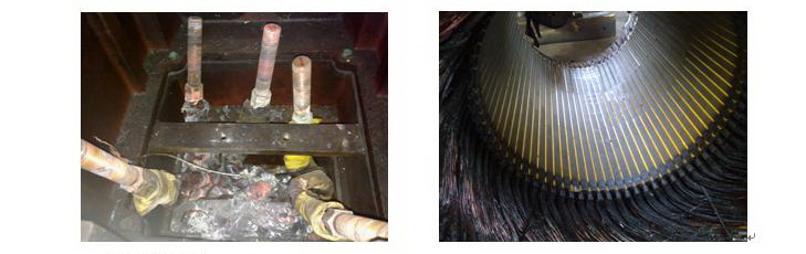電機檢查:將電機的接線盒打開后發(fā)現(xiàn),電機的接線柱子已近完全燒壞。后將電機全部拆開發(fā)現(xiàn)內(nèi)部繞組完全燒毀。見下圖: