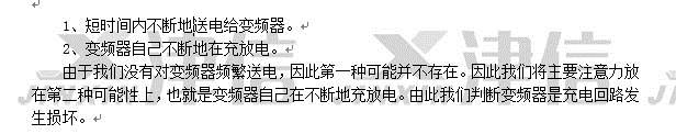 更換變頻器充電卡,依次安裝好變頻器的電源卡,控制卡,操作面板及上蓋板等。檢查變頻器的二極管特性及對地絕緣,符合送電的標(biāo)準(zhǔn)。將變頻器送電,自檢通過后,測量輸入側(cè)電源電壓,輸入變頻器參數(shù),開機(jī)輸出電壓平衡。帶負(fù)載測量輸入和輸出電流平衡,變頻器修復(fù)。