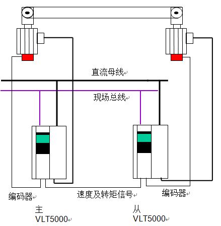 變頻器由共用直流母線供電, 丹佛斯可提供整流/回饋裝置或由用戶提供. 各分部速度可由現場總線提供, 也可由變頻器本身形成速度鏈. 變頻器采用速度閉環控制. 從變頻器的速度參考值由主變頻器給定. 同時主變頻器提供給從變頻器轉矩信號. 從變頻器根據其轉矩與主變頻器的差別, 動態修正從變頻器的轉速, 從而保證兩個變頻器出力一致. 所有運算通過可自由編程的工藝控制卡實現.