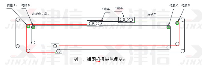 新型鋪網(wǎng)機的工作原理見圖一,其中伺服A為下跑車的驅(qū)動伺服,決定了下跑車的運行速度;下跑車就是鋪網(wǎng)頭,下跑車的速度就是鋪網(wǎng)機的鋪網(wǎng)速度。伺服B驅(qū)動前碳簾運行,前碳簾a段速度是鋪網(wǎng)機的原料輸入速度,要與前端設備速度同步。伺服C驅(qū)動上跑車運行。伺服D驅(qū)動后碳簾運行。伺服E驅(qū)動底簾運行。前碳簾在下跑車出口處的速度就是原料的出口速度。如果要求均勻鋪網(wǎng),則出料速度必須等于下跑車速度的絕對值;另外要求原料輸入速度要等于Vi,保持恒定不變。根據(jù)上述兩條基本運動約束條件,可以分別推算出各臺伺服在鋪網(wǎng)時的運行速度特征曲線。