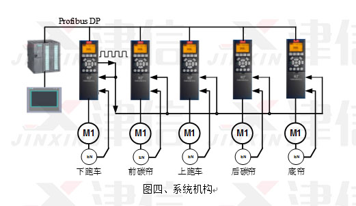 驅(qū)動系統(tǒng)的整體結構如圖四,每根軸獨立按自己的電子凸輪曲線運行,屬于典型的分布式控制系統(tǒng),對主控制器的性能要求,一般的PLC就能勝任。由于每根軸都與主軸保持電子凸輪同步關系,所以總體上可以實現(xiàn)多軸同步的控制需求。其中下跑車運動控制器比較特殊,他具有虛擬主軸脈沖輸出的功能,代替主控制器發(fā)送主軸脈沖信號。