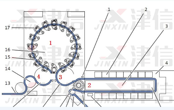 注:圖中機(jī)構(gòu)1為吹塑站,2為加熱爐,3為取胚機(jī)械手,4為取瓶機(jī)械手;